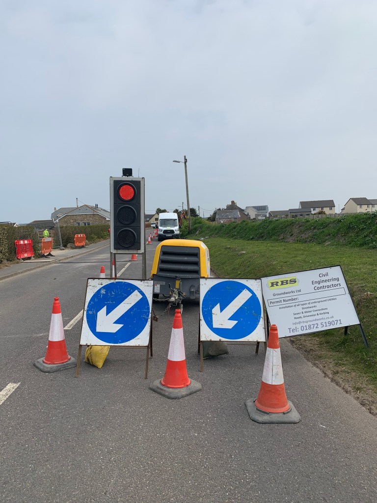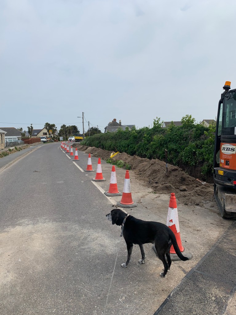 On a positive note, utilities contractor, RBS, arrived promptly to start digging up the A30 approximately 1 mile from Land’s End! The installation of traffic lights just by our new driveway gave quite a sense of power! Which is why it was really quite a disappointment when the biggest traffic jam we created was only 3 cars long! Even Reggie looked underwhelmed! Still …. next week we will have electricity and running water on-site!