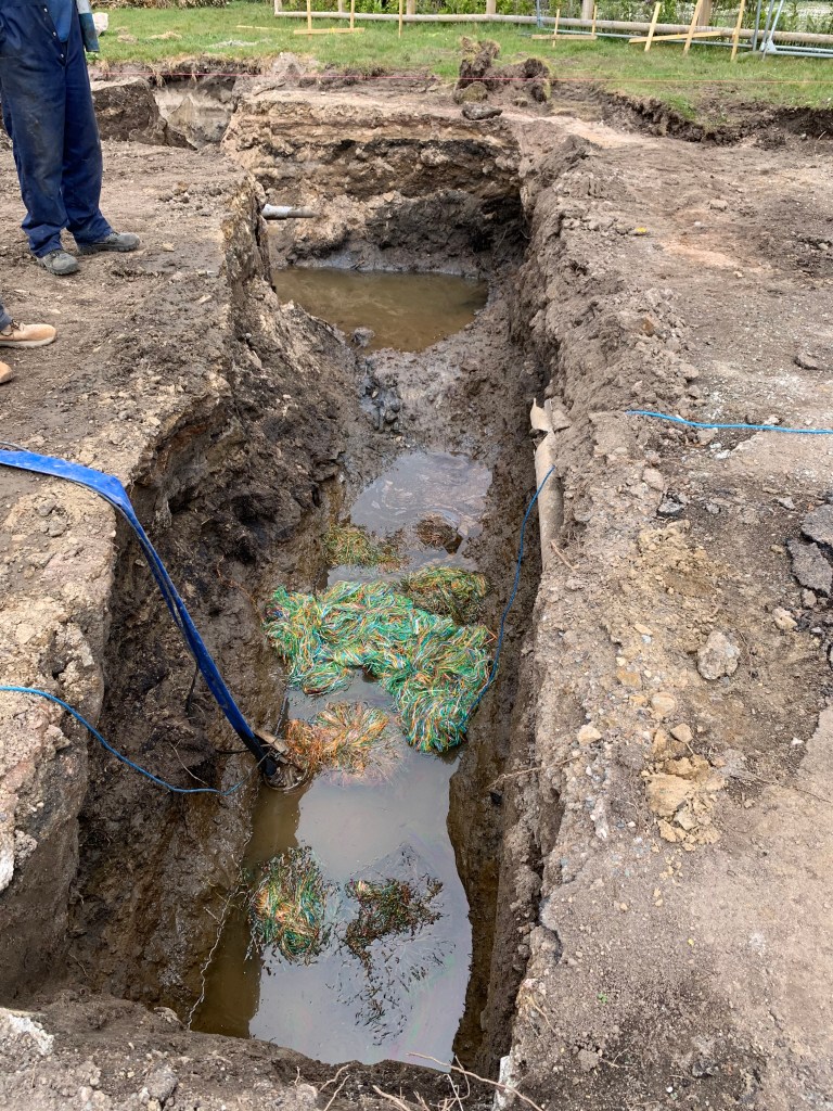The last blog reported that excavations had uncovered a large amount of contaminated waste which had to go off to be tested by a specialist lab “up country” somewhere! No chance then of draining off the groundwater onto the nearby field. So we were stuck with oily water continuously filling up the new trenches under what will be our bedroom.