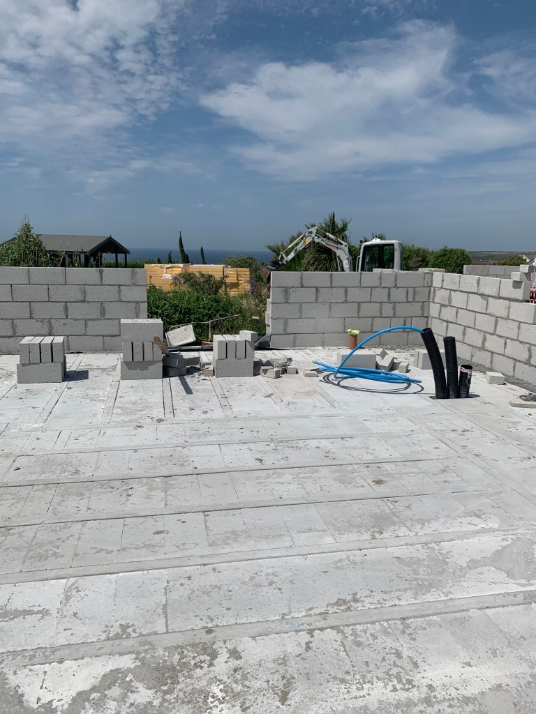 As soon as we got back, we headed for Sennen, excited to see what had been happening on site. When we left, the blockwork was well out of the ground with a solid concrete base marking out the floors. Progress has been slower that we’d expected, however. The lag times for materials, combined with labour shortages and rising prices is starting to bite.
