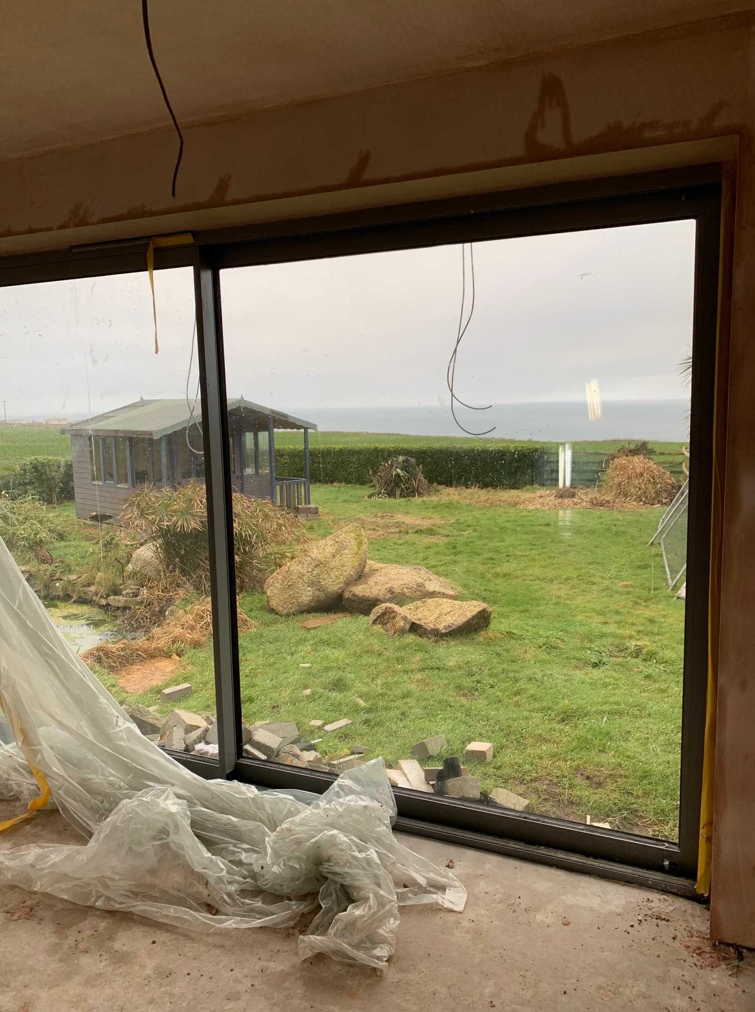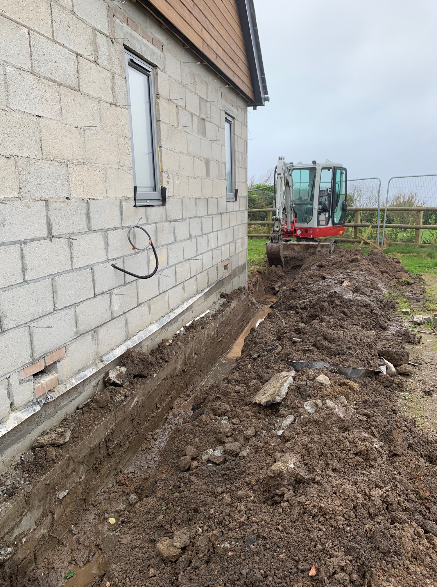With the wind at our back, and a real sense of trepidation, Reggie and I climbed back up the hill towards “Delamere”. Would our roof have survived? What about the summerhouse? Not to mention the risk to our windows of flying timbers, loose rubble or even the odd ladder!! But all was well and the house seems to have withstood the storm (so far!!). It may have taken ages to finish but the roof has held up well! Looks like they have now started the outside drainage work so we should soon be connected into the main sewerage system – a relief indeed!!